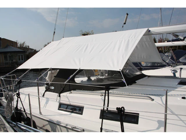 Sonnensegel aus UV-beständigem und wasserabstoßendem Polyestertuch. Reißverschlussöffnung für Toppinglift. Wird inkl. Befestigungsaugen und Stausack geliefert.