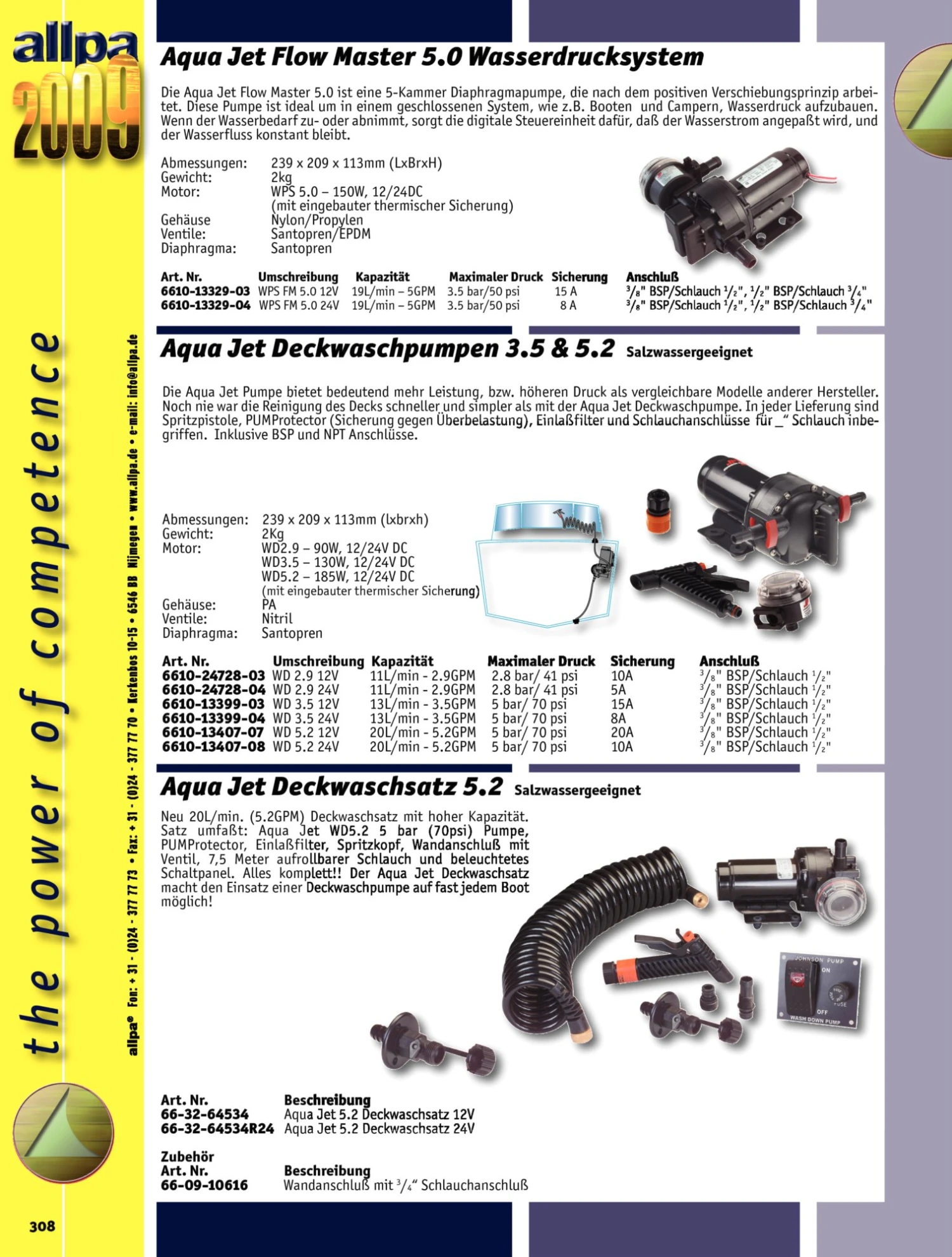 Neu! 20L/min. (5.2GPM) Deckwaschsatz mit hoher Kapazität. Satz umfaßt: Aqua Jet WD5.2 5 bar (70psi) Pumpe, PUMProtector, Einlaßfilter, Spritzkopf, Wandanschluß mit Ventil, 7,5 Meter aufrollbarer Schlauch und beleuchtetes Schaltpanel. Alles komplett!! Der Aqua Jet Deckwaschsatz macht den Einsatz einer Deckwaschpumpe auf fast jedem Boot möglich